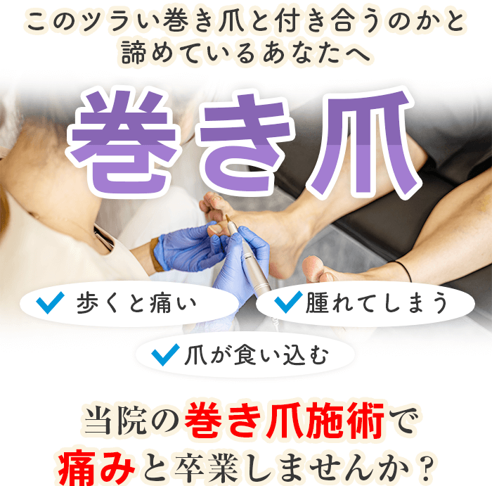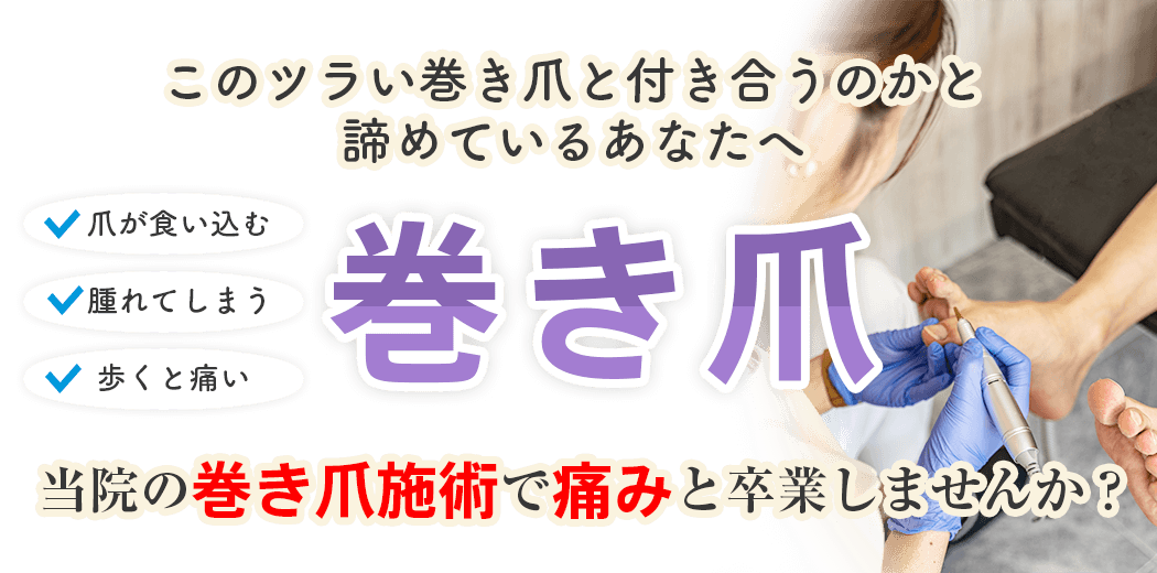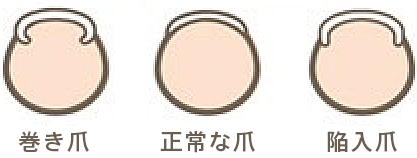 巻き爪とは爪の先端が内側に巻いたように変形して、皮膚を挟んでしまう状態。